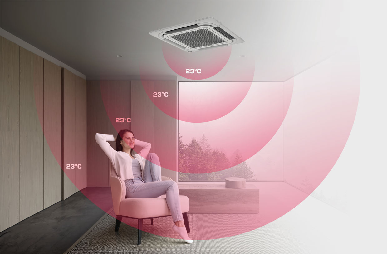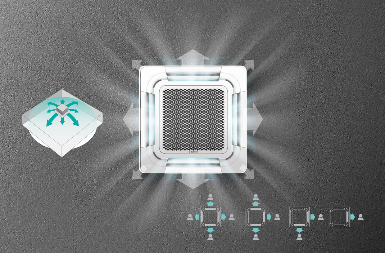 Round Flow hava dağıtım teknolojisi, 360° yönlü üfleme özelliği sayesinde iç mekân hava sirkülasyonunu maksimum verimlilikle optimize eder. Bu sistem, havanın homojen şekilde tüm alanlara iletilmesini sağlayarak sıcaklık dağılımında termal denge oluşturur ve ölü hava alanlarını minimize eder. Sonuç olarak, tüm hacimde dengeli iklimlendirme ve üstün konfor koşulları elde edilir.